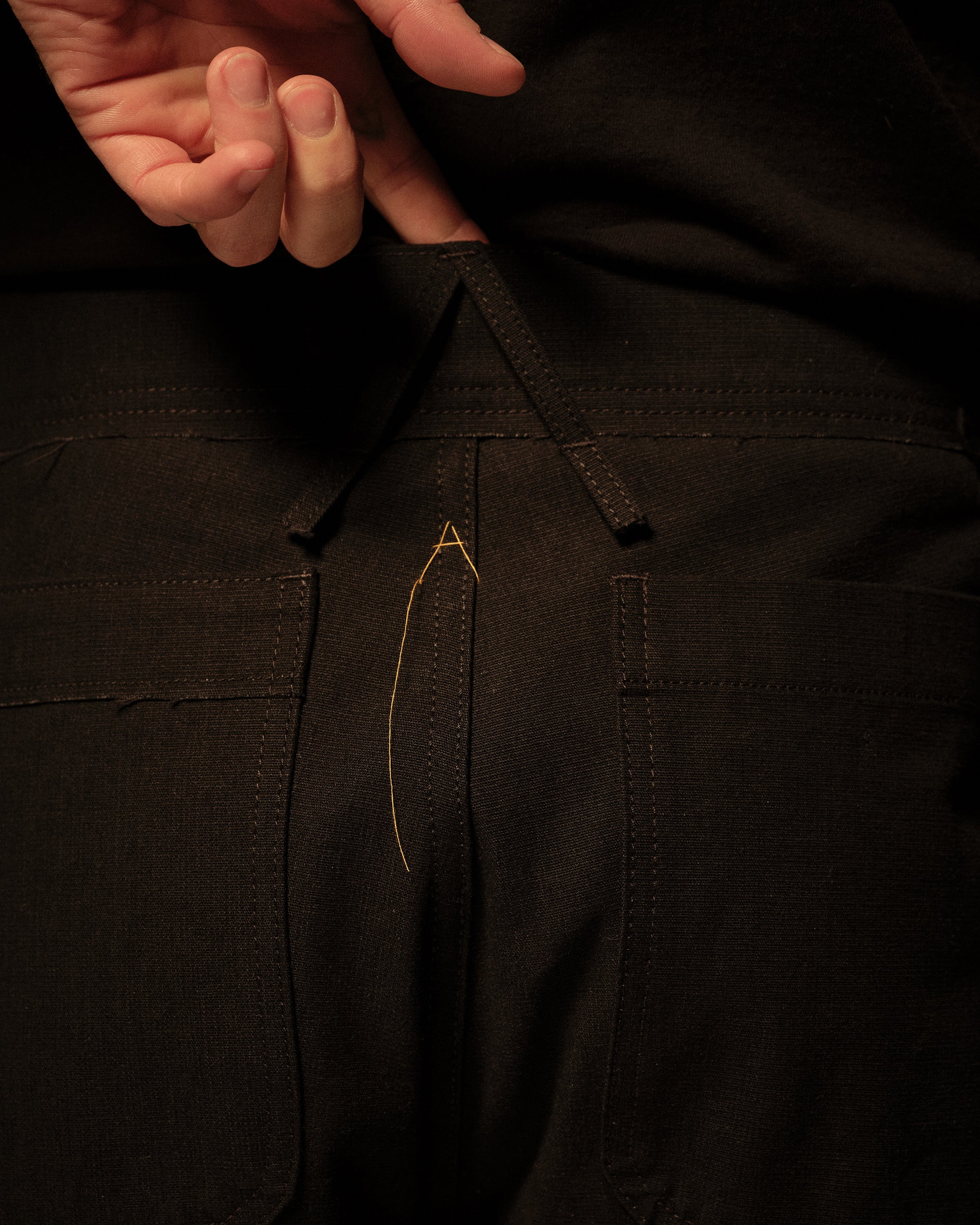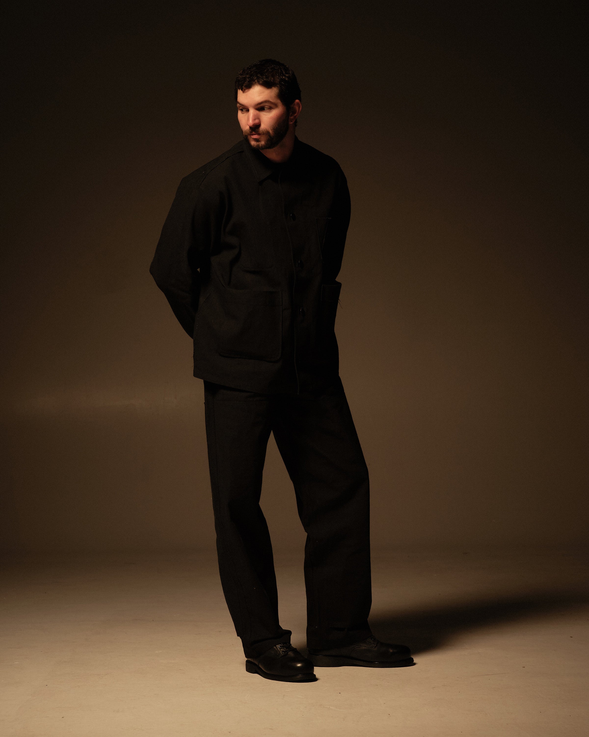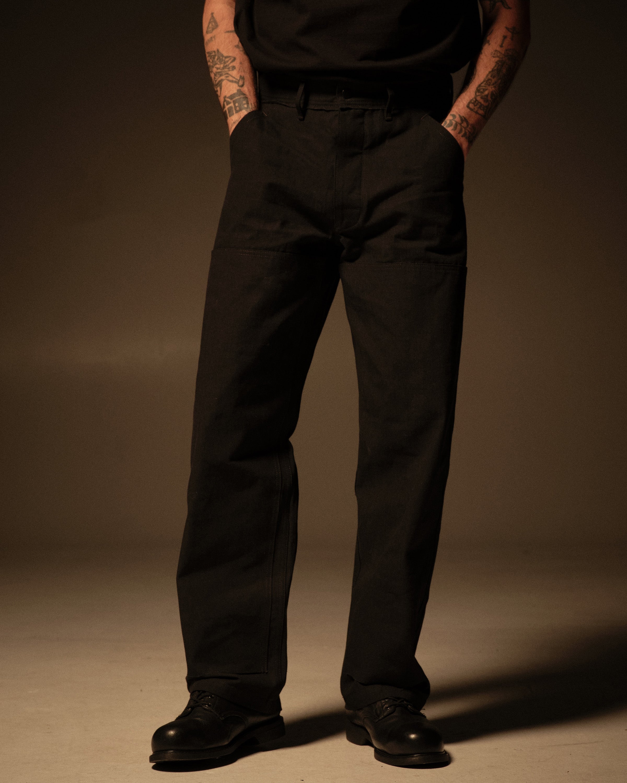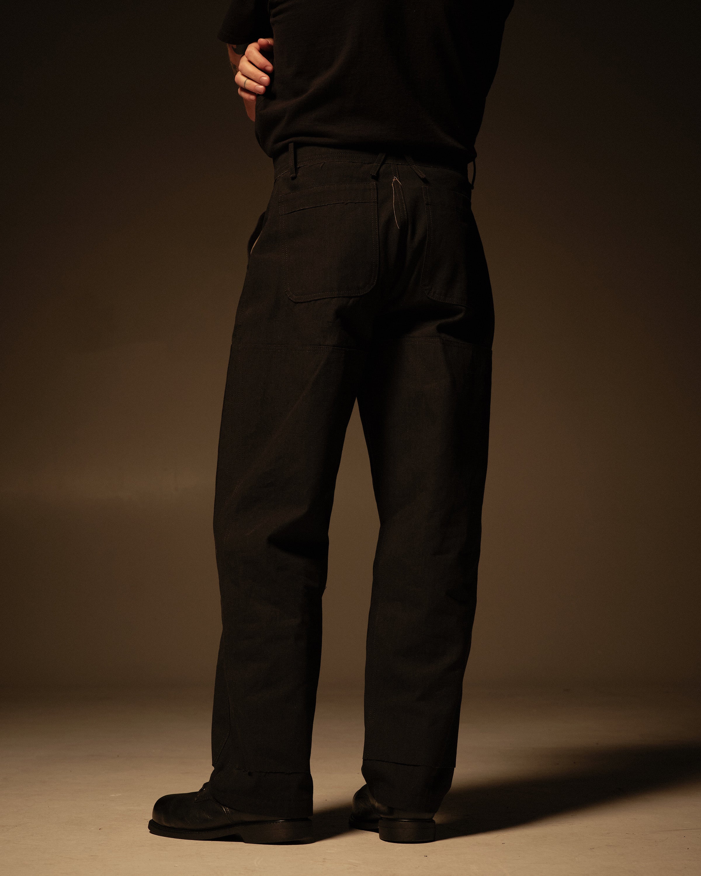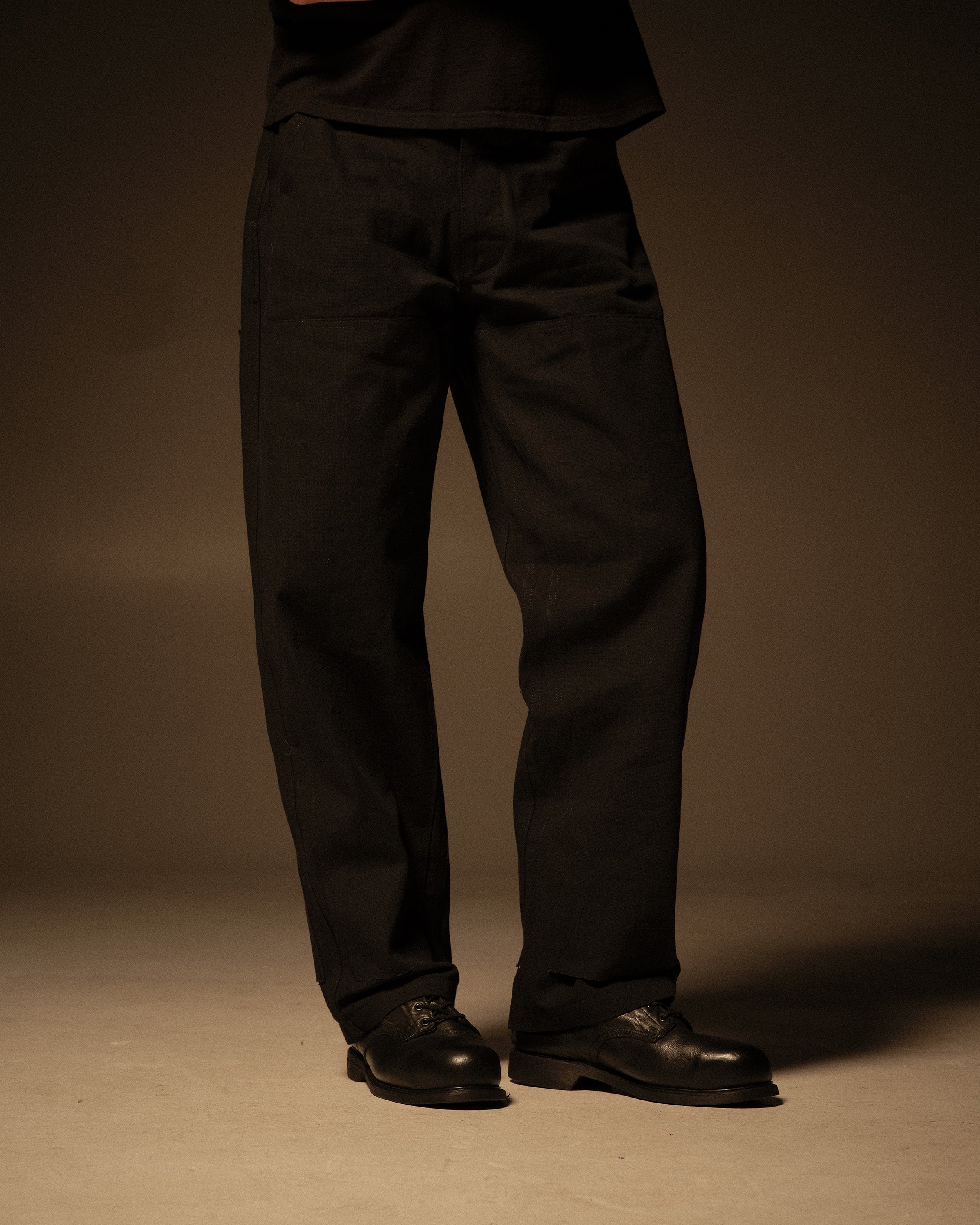 Cut with a straight, workwear‑inspired leg, the pant features double‑knee panels on both the front and back with raw edges at the bottom of each panel, rounded back patch pockets, and angular front pockets for everyday use. The waist is finished with a raw edge, reinforcing the unfinished character of the garment. Made from black‑on‑black 11.5 oz Cone bull denim, a dense 100% cotton denim chosen for its durability, texture, and the way it softens and fades with wear, and finished with a Riri Cobrax button fly.