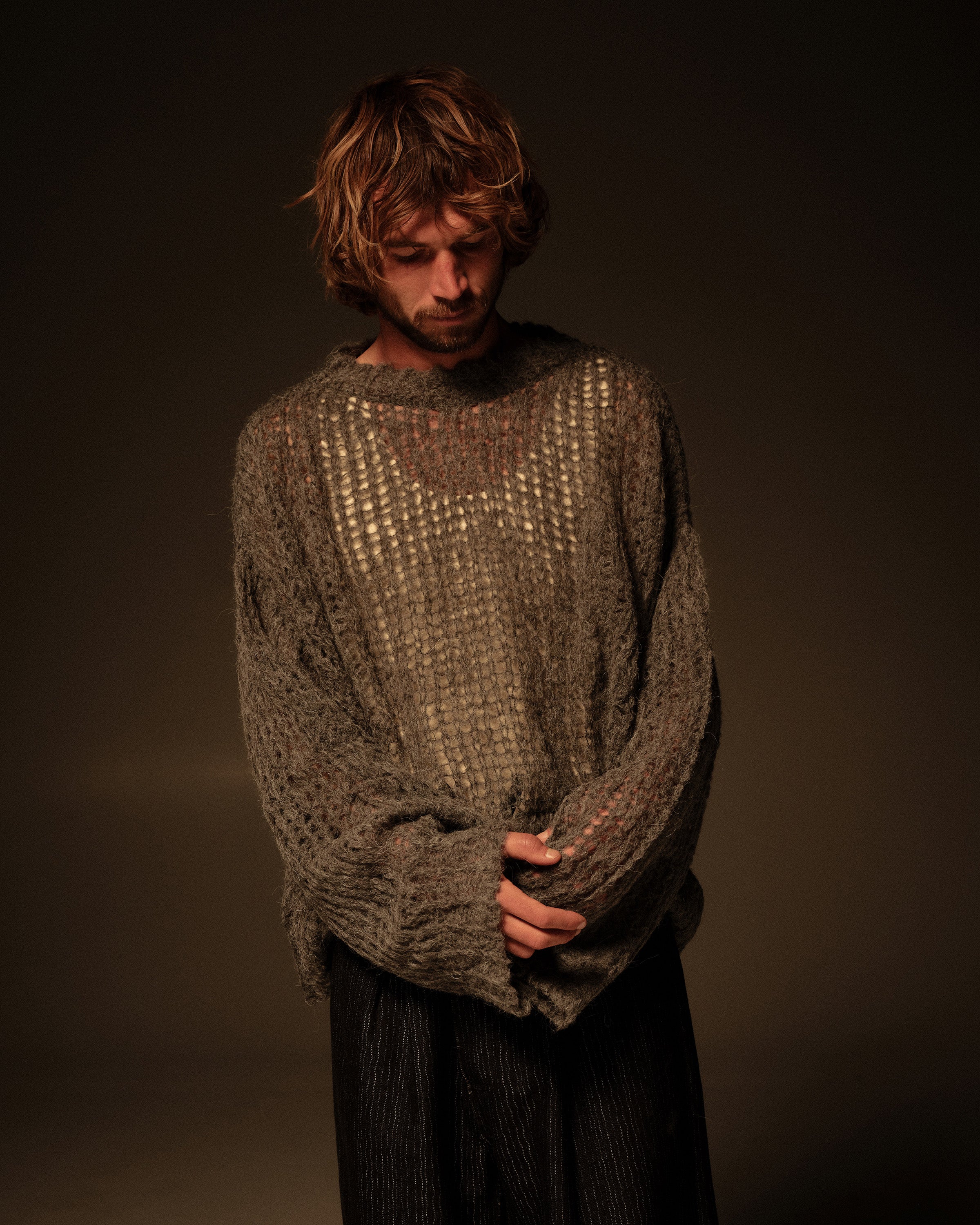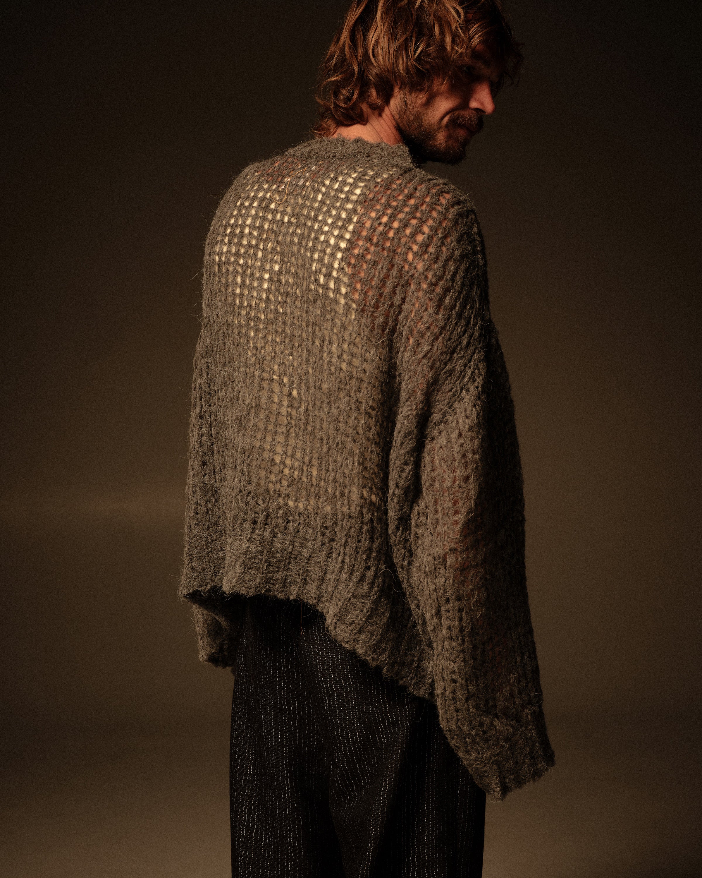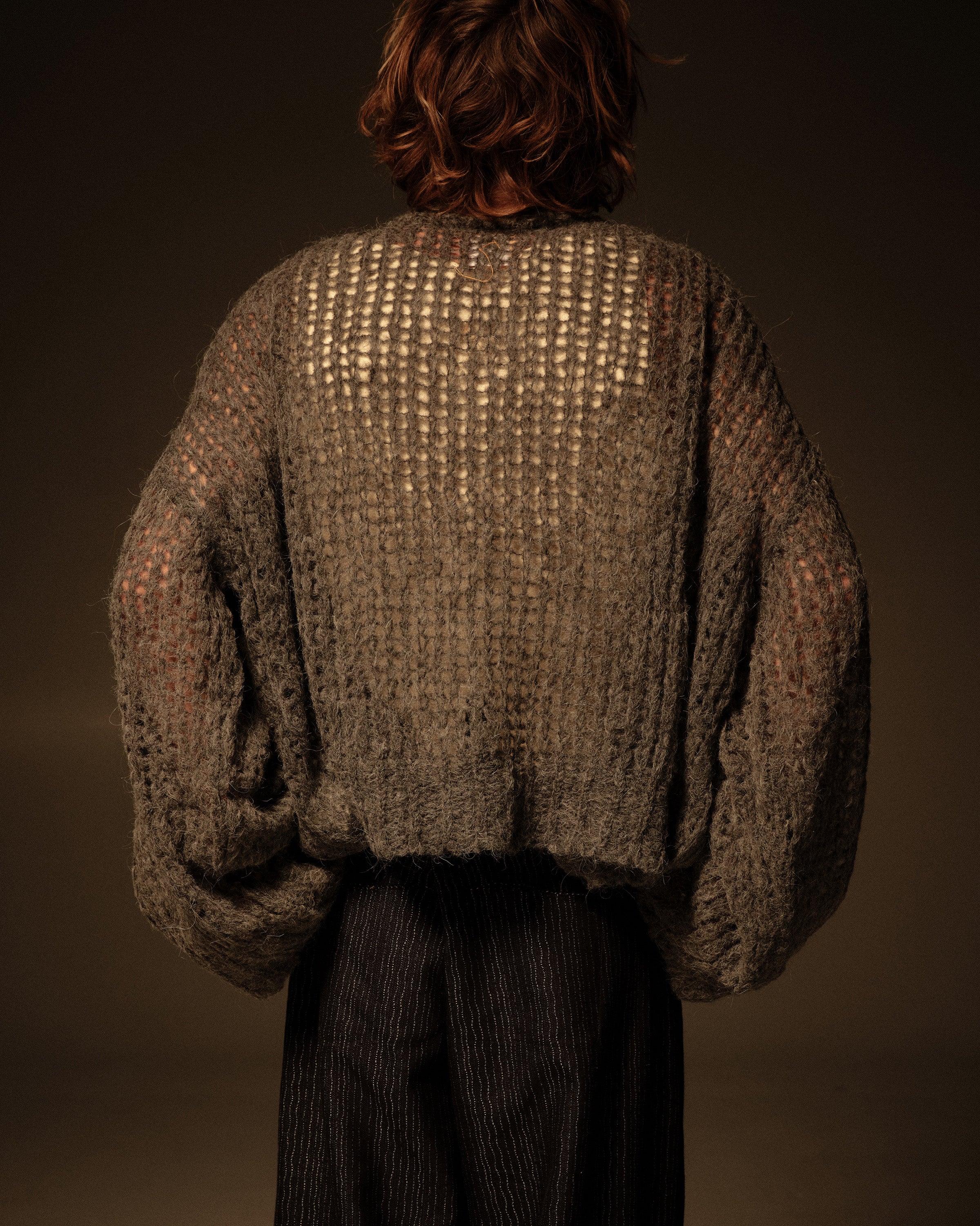 An AIREI ARKETYPE sweater based on our open‑knit alpaca piece from the second collection, recreated to spec in an oversized, cropped silhouette with long sleeves.
