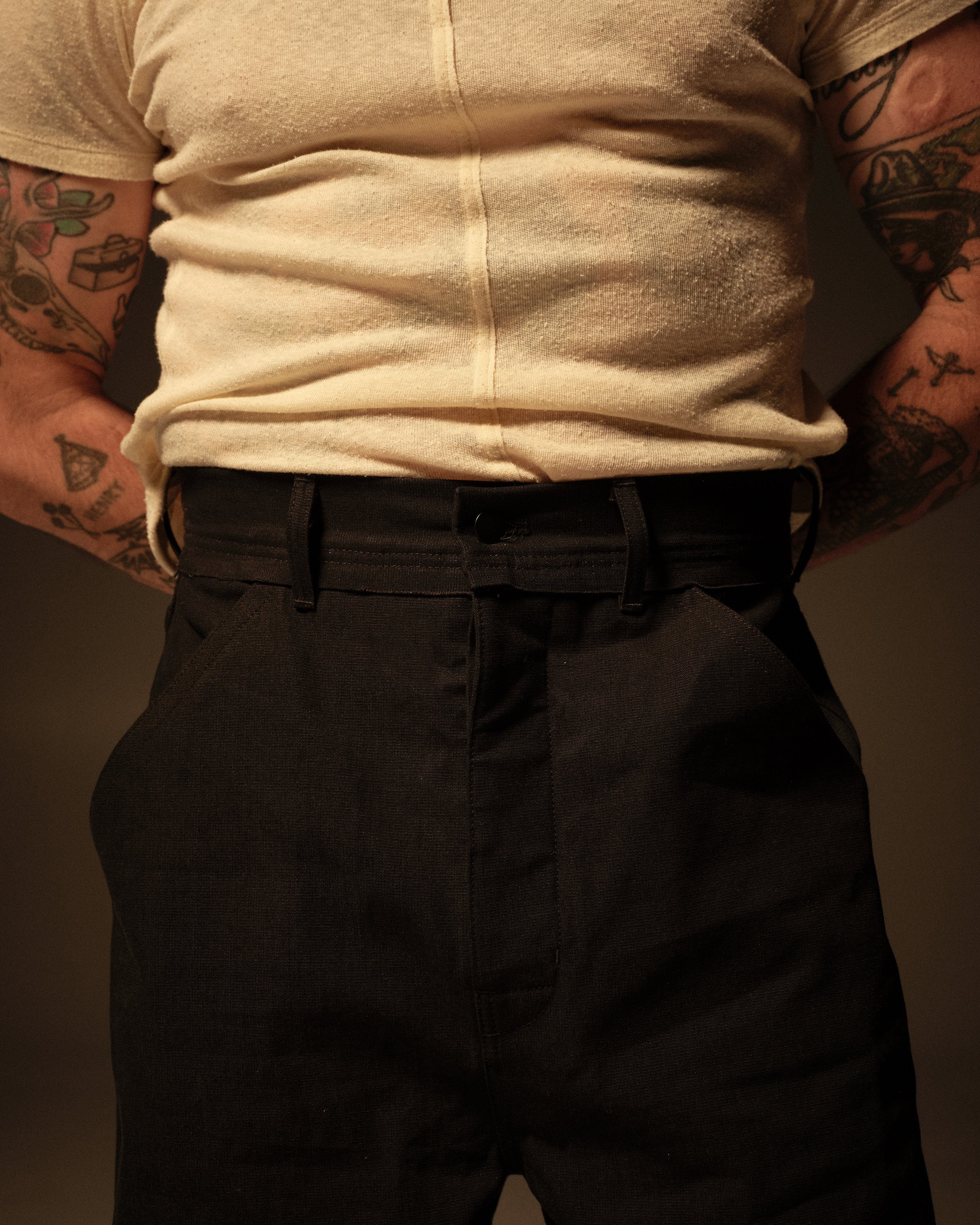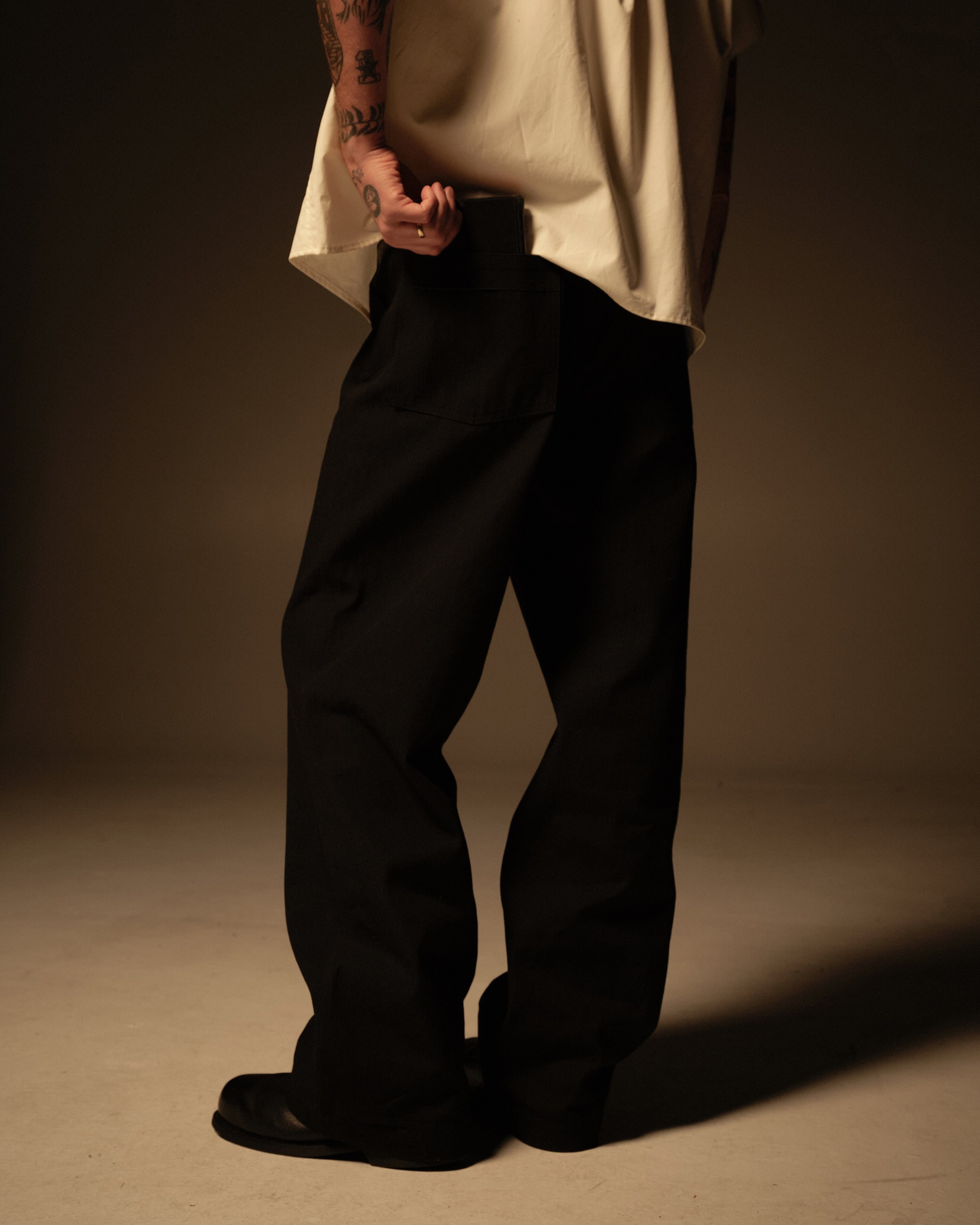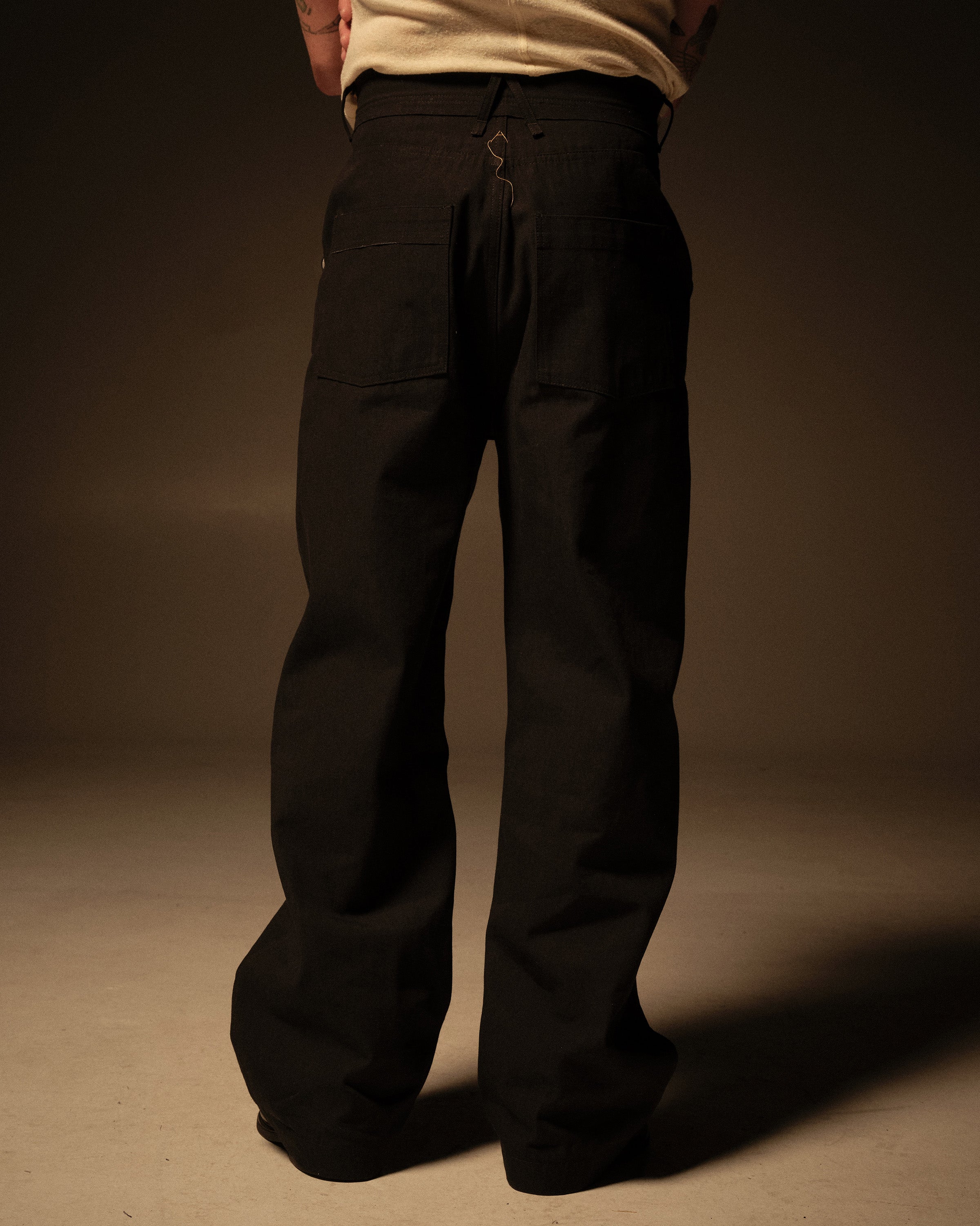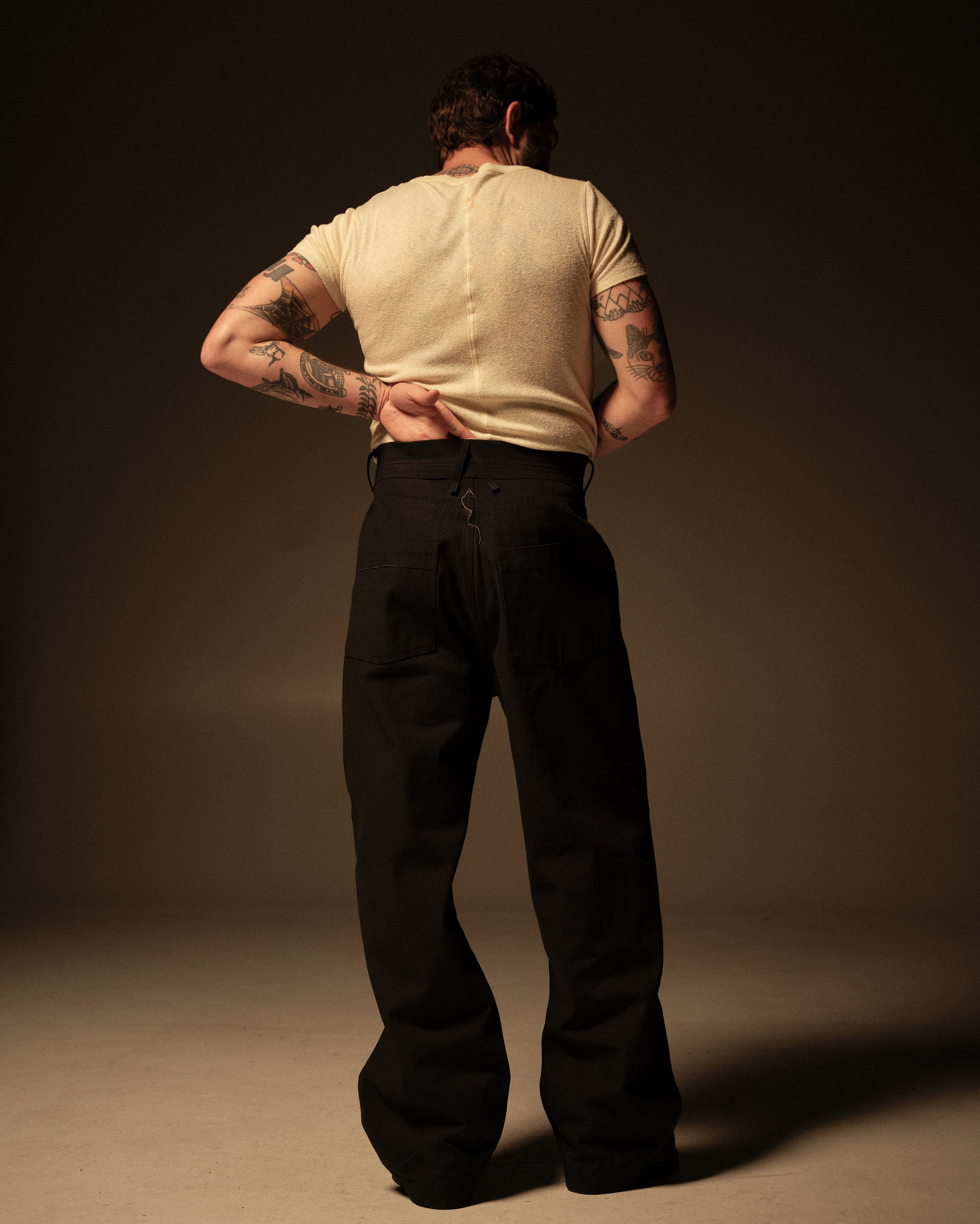 Cut as a high‑rise, stacked straight leg, it is made from black‑on‑black 11.5 oz Cone bull denim, a dense 100% cotton denim chosen for its durability, texture, and the way it softens and fades with wear. The pant features a raw waistband, angled front pockets, traditional back pockets, and is finished with a Riri Cobrax button fly.