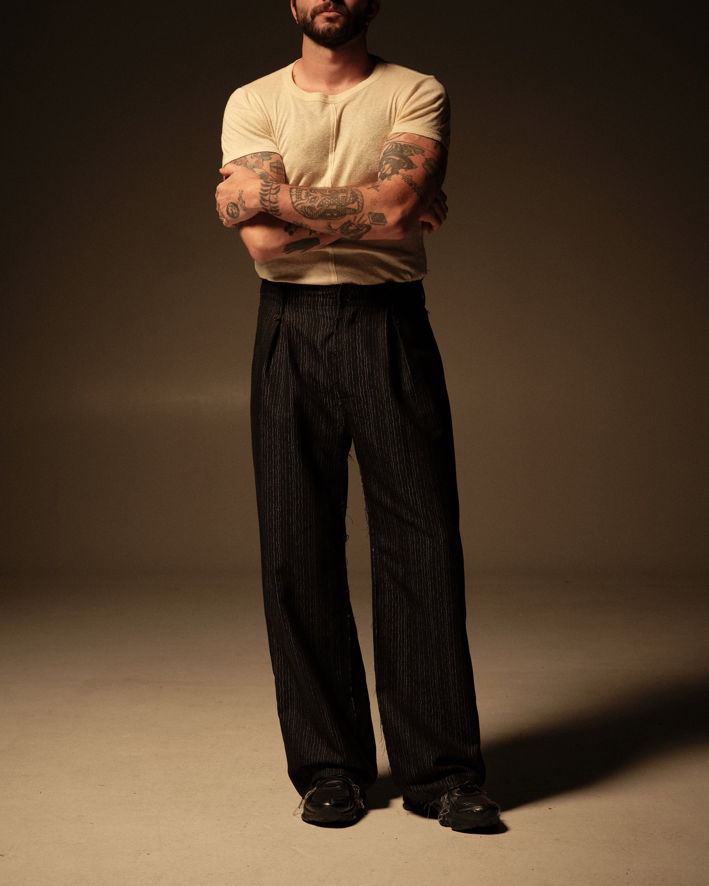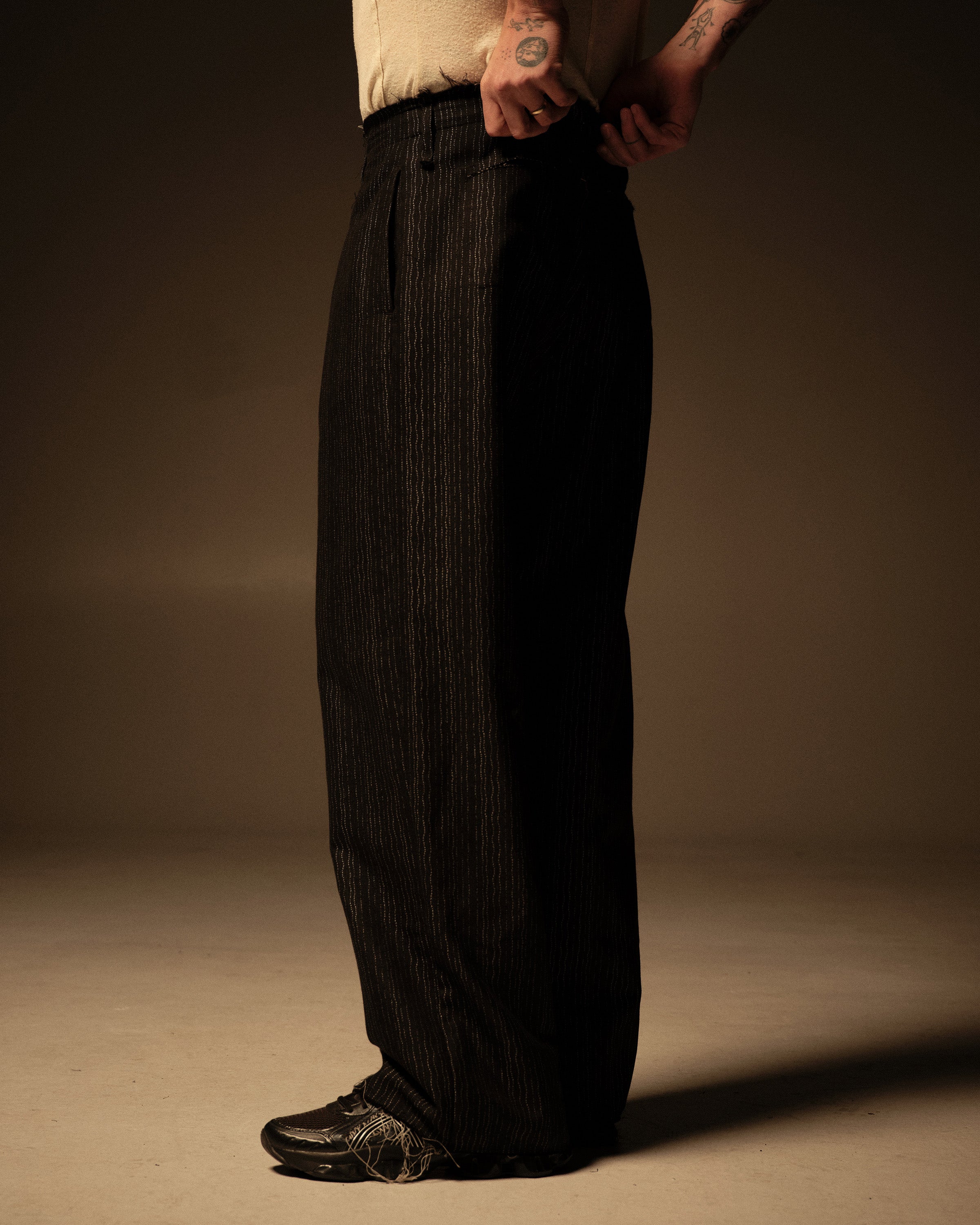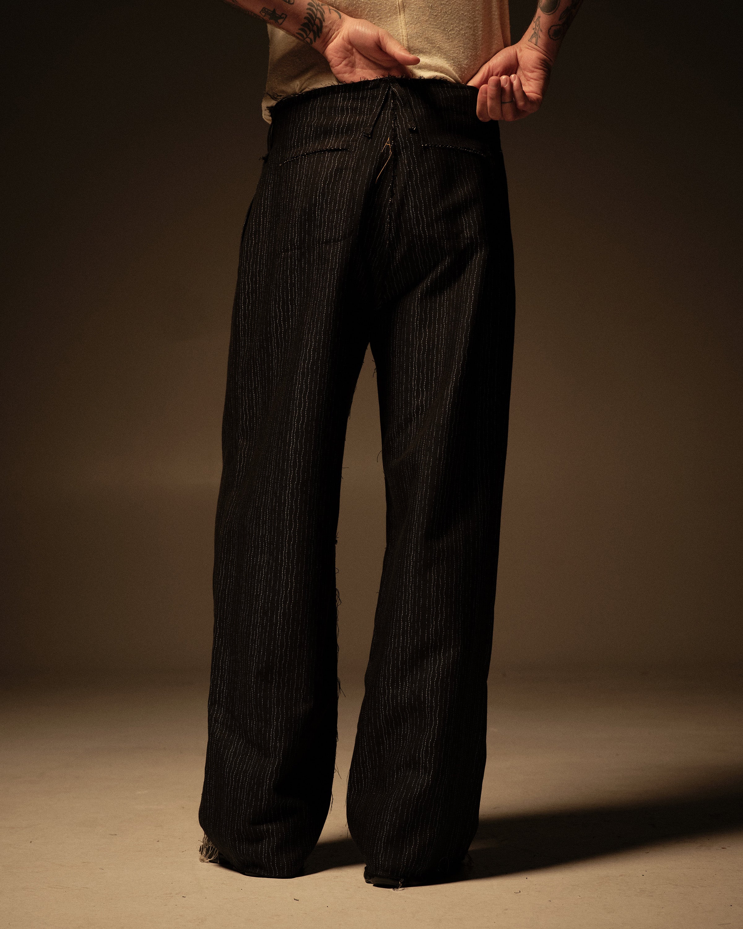 Made from a soft, light compact striped cotton–wool diagonal, woven in Italy and sourced as deadstock from a luxury maison, the fabric has a subtle, imperfect vertical stripe. The pants are built with an intentionally unfinished aesthetic: a hidden inner waistband allows the garment to feel as if it is pulled together on its own, and the top edge is left raw. The pair is finished with front box pleats, a hidden corozo nut button fly, and raw‑edge welt pockets at the back.